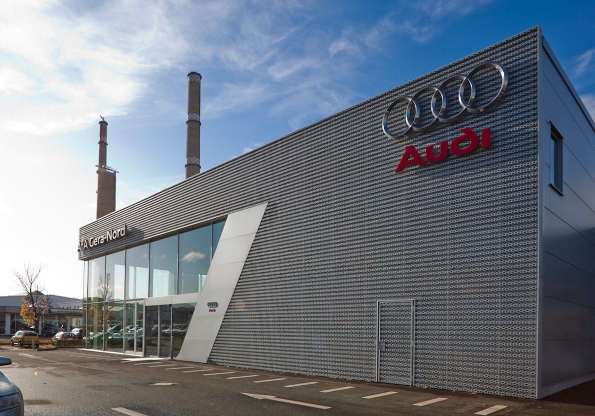Die Audi AG hat mit dem Audi-Terminal eine neue Markenarchitektur für ihre Vertragspartner konzipiert – denn die wachsende Zahl neuer Modelle erfordert größere Präsentationsräume. Nach Sydney, München, Genf und Potsdam entstand in Gera-Nord für das Autohaus AfA „Alles fürs Auto“ eines der ersten Terminals in der neuen Architektur. Dabei prägt dei Steilkurven-Wand den Innenraum des Audi-Terminals - mit 60° Neigungswinkel und einem Radius von 135 m dient sie gleichzeitig als Raumabschluss, Deckenschürze und Brüstung. Ebenso vielfältig sind die darin integrierten Produkte – von Gipskarton über Spezialplatten bis hin zu individuell vorgefertigten Formteilen.
