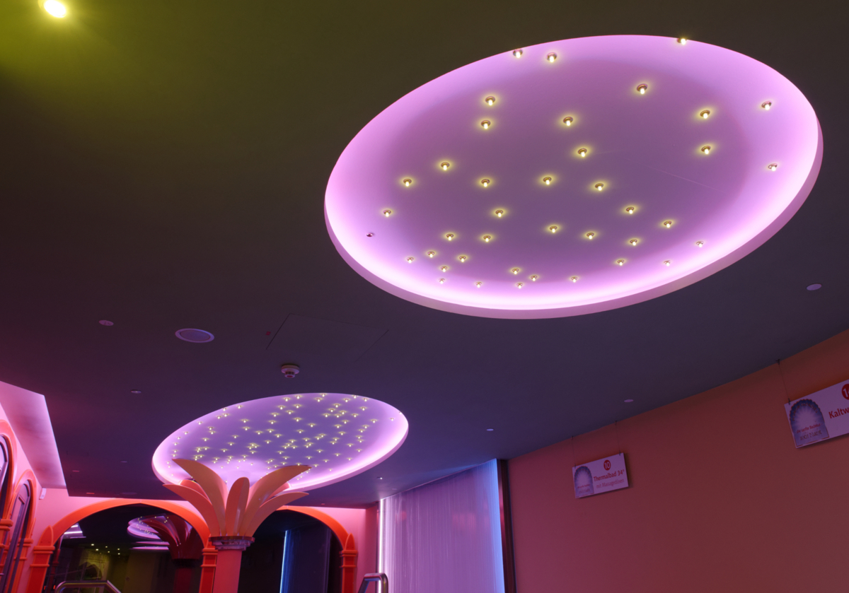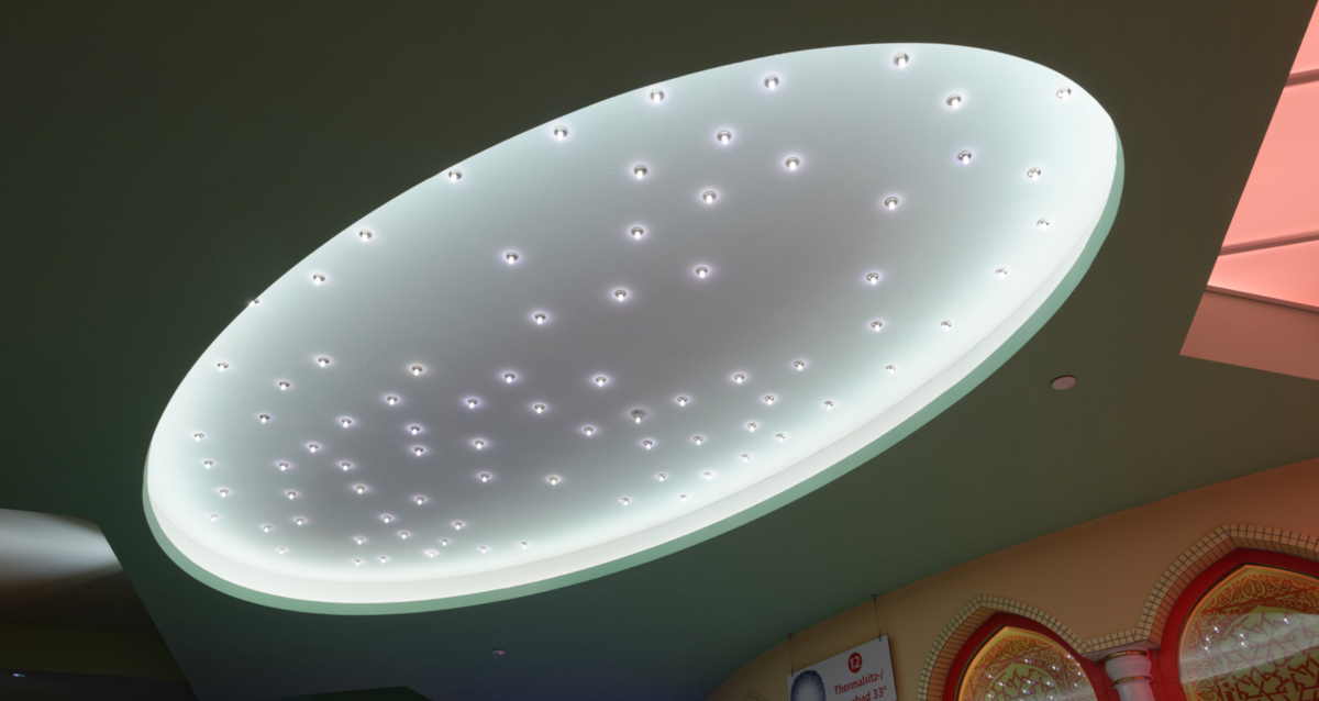 Wasser- und Thermalbecken, Duschtempel, Warmluft-, Heißluft- und Dampfbäder, Salzsteinliegen in der Lichtseehöhle und der heiße Stein im Hamam Centrum. Eine Badekur aus 15 Stationen leitet durch die vielseitige Erholungslandschaft aus Licht, Farben und Formen. Räumlich vermitteln vor allem der große Sternenhimmel sowie die goldenen Kuppeldächer das Gefühl von Morgenland. Palmensäulen und Ornamentfliesen vervollständigen das Bild. Die beeindruckende Formenvielfalt, aber auch die großen Differenzen von Temperatur und Luftfeuchte in den einzelnen Badbereichen stellten hohe Anforderungen an die eingesetzten Materialien und machten einen Ausbau mit speziellen Trockenbau-Lösungen erforderlich.