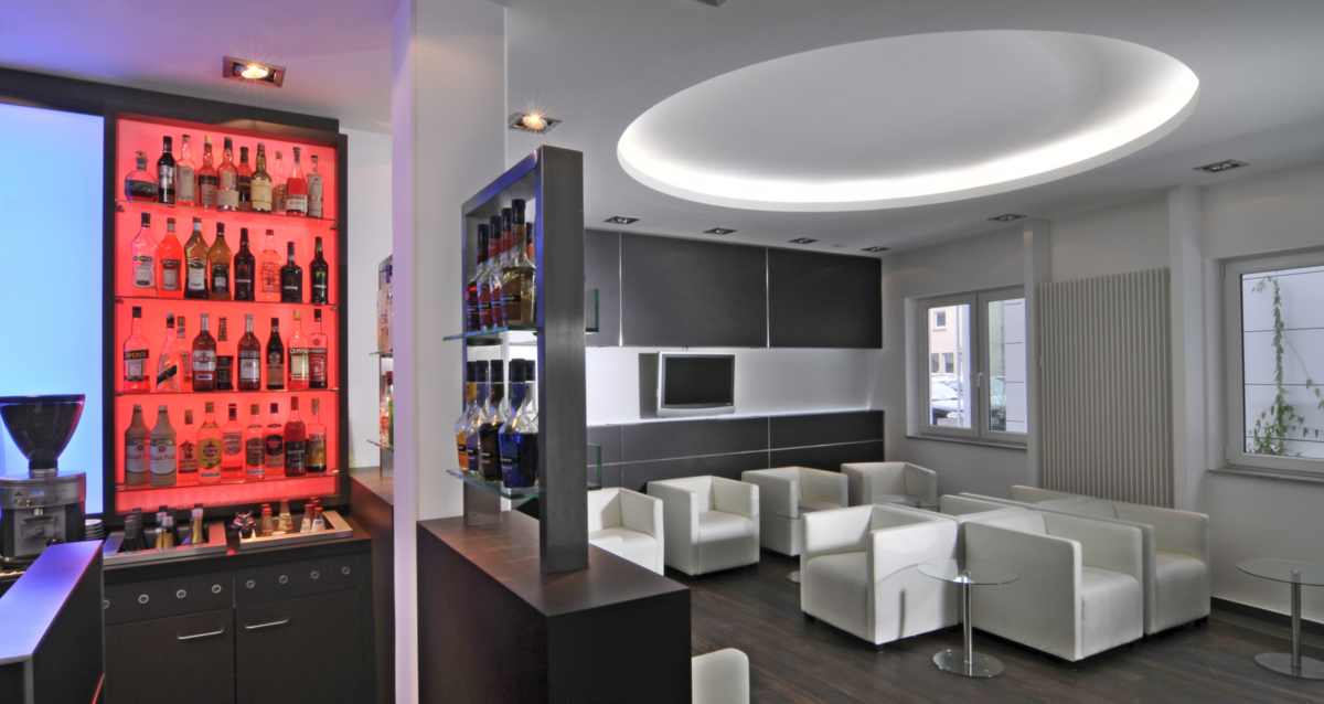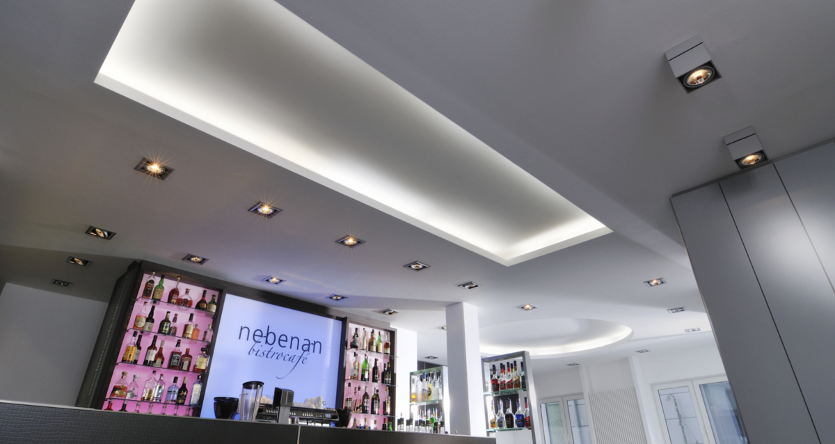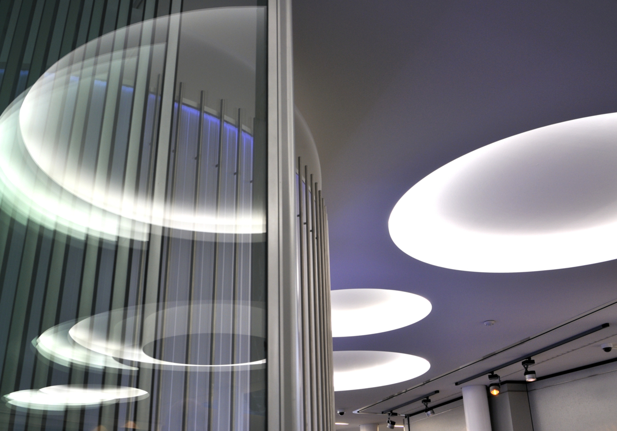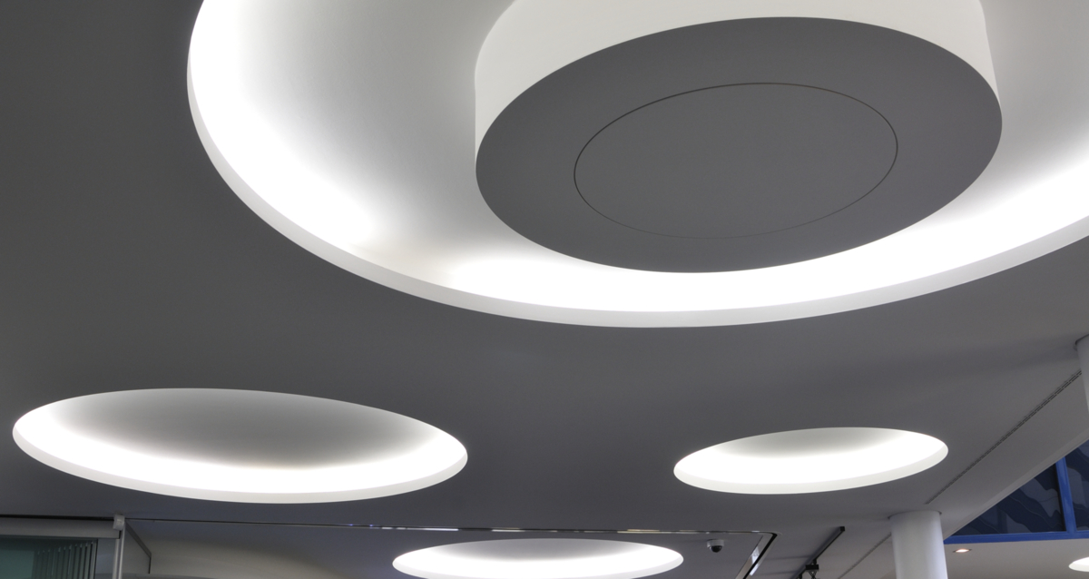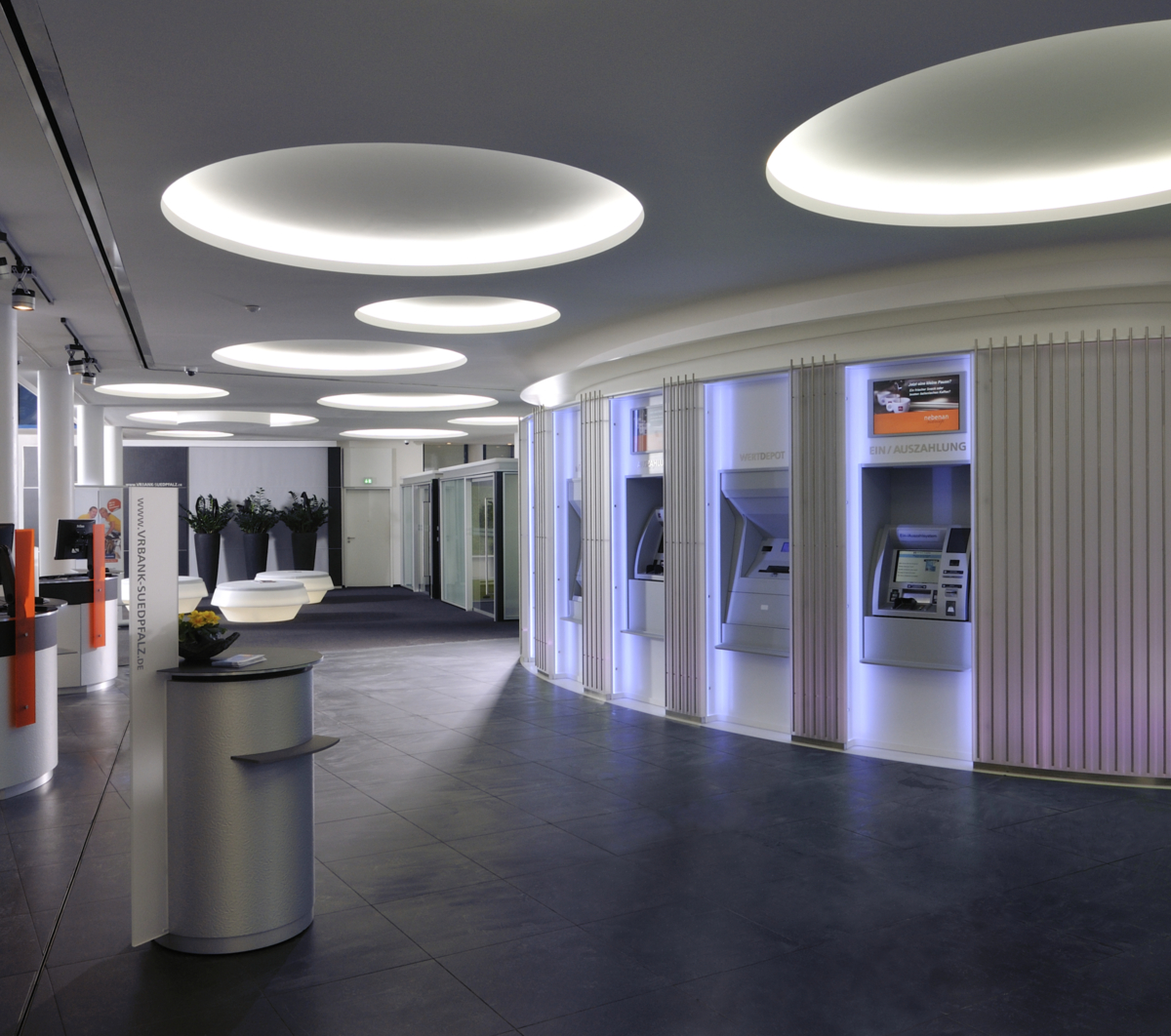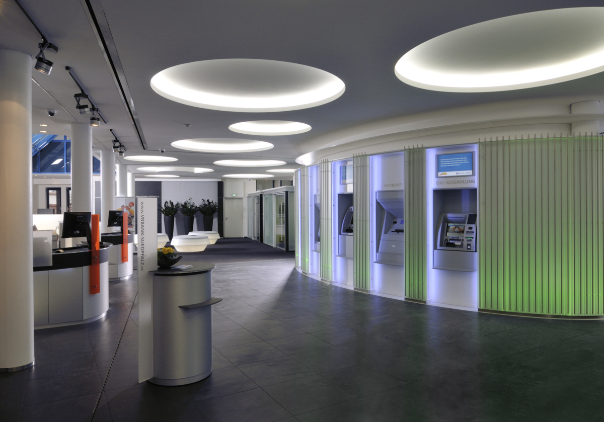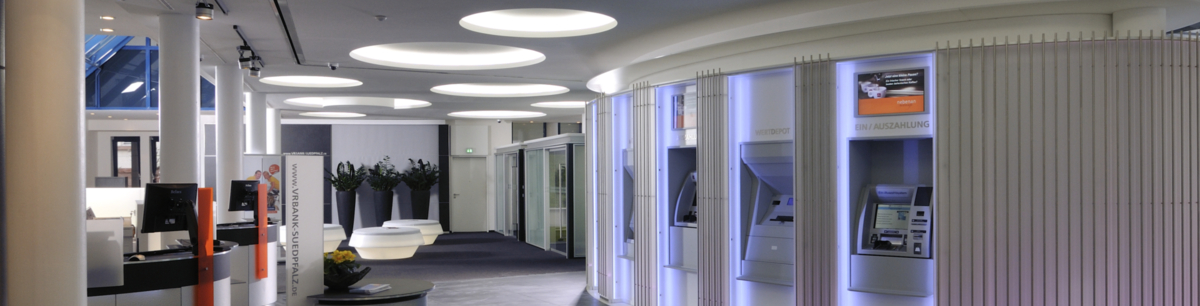 Hellere, freundliche Atmosphäre – die modernisierte Hauptstelle der VR Bank Südpfalz in Landau bietet jetzt deutlich mehr Raum für „aktiven“ Service. Im Zentrum steht nun eine Acrylellipse mit multifunktionalen 24 h-SB-Servicegeräten umgeben von modernen Pulten und gläsernen Büros für den persönlichen Kontakt. Dabei unterstützt die Deckengestaltung den Wunsch zu kommunizieren. Der Raum zwischen Lüftungsrohren wurde mit Lichtkreisen aus LaForm Gips-Formteilen optimal genutzt. Die geforderte Oberflächenqualität Q3 wurde mit der weißen Gipsplatte LaDeko mit minimalem Spachtelaufwand erzielt.